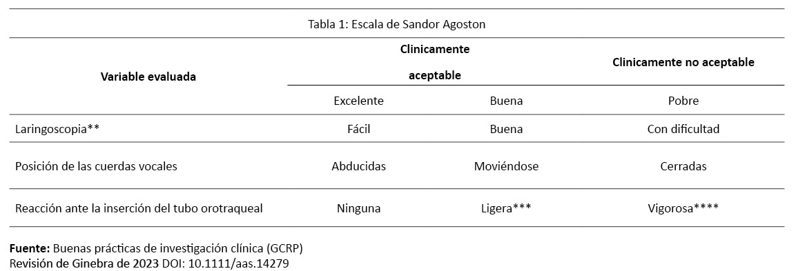 No obstante, en el caso de ausencia de la monitorización neuromuscular pueden ser usados métodos clínicos como escalas para evaluar condiciones de intubación, siendo la más aceptada la escala de Sandor Agoston, (Tabla 1) la cual fue diseñada en el año 1994 en el consensus de Copenhague e internacionalmente adoptada como la guía para estudios clínicos con bloqueadores neuromusculares (BNM) en el año 2007, donde proponen estandarizar su observación mientras se realiza la laringoscopía directa para poder ser comparada en diferentes situaciones y contextos clínicos (9).