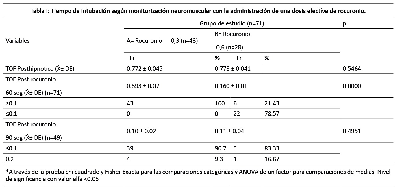 En cuanto al tiempo de intubación según la monitorización neuromuscular con la administración de una dosis efectiva de rocuronio en pacientes preescolares, para la relación de tren de cuatro posthipnótico, la media en el grupo A fue de 0,772 (± 0.045) y en el Grupo B fue de 0,778 (± 0,041), sin diferencias significativas entre los grupos (p = 0,5464).