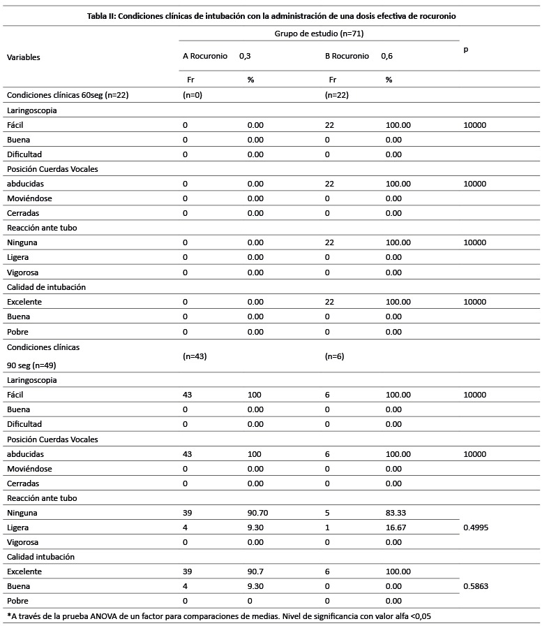 A los 90 segundos, ambas dosis ofrecieron condiciones clínicamente aceptables para la intubación, con laringoscopía fácil y cuerdas vocales abducidas en la totalidad de los pacientes, así como una baja incidencia de reacciones ante el paso del tubo. La calidad de intubación fue calificada como excelente en el 90,66 % del Grupo A y en el 100 % del grupo B, también sin diferencias significativas (p = 0,5863), estableciéndola como condiciones clínicamente aceptables para intubación.