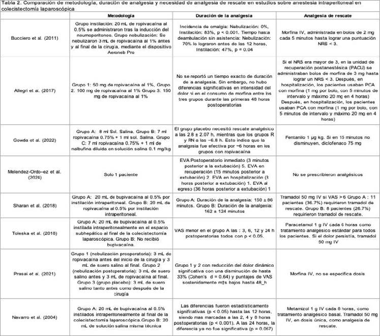 El estudio de Bucciero et al. (19) utilizó nebulización intraperitoneal de ropivacaína al 1% en una dosis de 3 mL antes y después de la cirugía. En el estudio de Allegri et al (22), se evaluaron tres dosis diferentes de ropivacaína nebulizada: 50 mg, 100 mg y 150 mg. Gowda et al (20) administró 7 mL de ropivacaína al 0,75 %, con o sin nalbufina. El caso clínico de Meléndez-Ordóñez et al. (2024) (6) aplicó 3 mL de ropivacaína al 1 %. En cuanto a la bupivacaína, Toleska et al. (18) instiló 20 mL de bupivacaína al 0.5 %. Sharan et al. (18), comparó la instilación de 20 mL de bupivacaína al 0.5 % con la misma dosis de ropivacaína. Prasai et al. (17), también utilizó instilación intraperitoneal de ropivacaína, pero sin especificar la dosis. Finalmente, Navarro et al. (16), administró irrigación peritoneal con 20 mL de bupivacaína al 0.5 %.