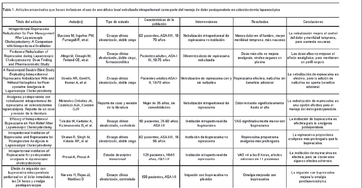 Las terapias analgésicas convencionales, como el uso intravenoso de opioides y antiinflamatorios no esteroideos, han demostrado ser insuficientes para el tratamiento efectivo del dolor postquirúrgico (4,7–9). Debido a la naturaleza del dolor tras la colecistectomía laparoscópica, varios autores han propuesto la analgesia local intraperitoneal como una alternativa eficiente para el tratamiento del dolor postoperatorio. Sharan et al [15], Navarro et al [16], y Toleska et al. [18], destacan la eficacia de analgésicos como la bupivacaína y la ropivacaína administradas intraperitonealmente mediante instilación o nebulización y su efectividad analgésica. Finalmente, estudios como los de Gowda et al (20), Bucciero et al [19], y Allegri et al, enfatizan el uso y la efectividad de la administración intraperitoneal de ropivacaína nebulizada en el control del dolor, subrayando su superioridad frente a la instilación como método local