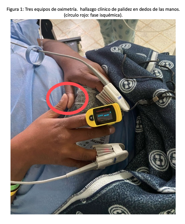 El día del procedimiento quirúrgico es ingresada a salas, al monitorizar la paciente se evidencia mala plestimografía en la medición de la oximetría. Como conducta se considera la utilización de tres oxímetros diferentes para descartar sesgos de medición evidenciando clínicamente que con la exposición al frio había palidez distal en los dedos de las manos (Figura 1).