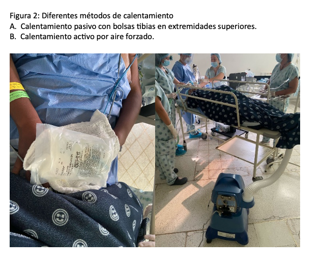 No se logró ningún resultado de saturación en distintas partes del cuerpo como manos, pies u orejas. Se decidió realizar métodos de calentamiento pasivo usando bolsas de agua tibia en extremidades superiores, además de métodos activos con manta por aire forzado y líquidos endovenosos tibios (Figura 2: A y B).